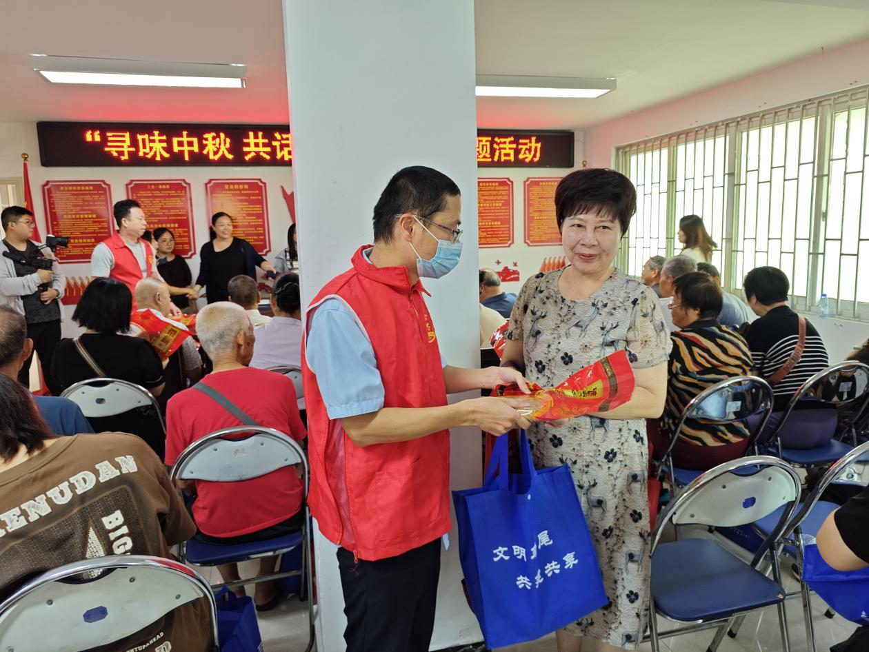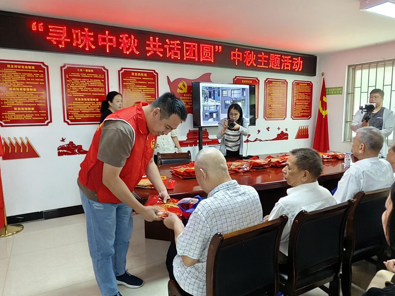 “恭喜爷爷博到了一袋抽纸。”“恭喜奶奶博到了一袋大米。”伴随着骰子和瓷碗碰撞发出的清脆声,“博饼”小游戏正式开始。社区老人们攥着骰子,神情既谨慎又期待,现场不时响起“中奖啦”的欢呼,温馨氛围感染着在场每一个人。最后,为让辖区特殊人员感受到大家庭的温暖,马尾管理部党员志愿者与共建单位志愿者还开展了慰问帮扶活动,为他们送去中秋月饼一份和节日的祝福。