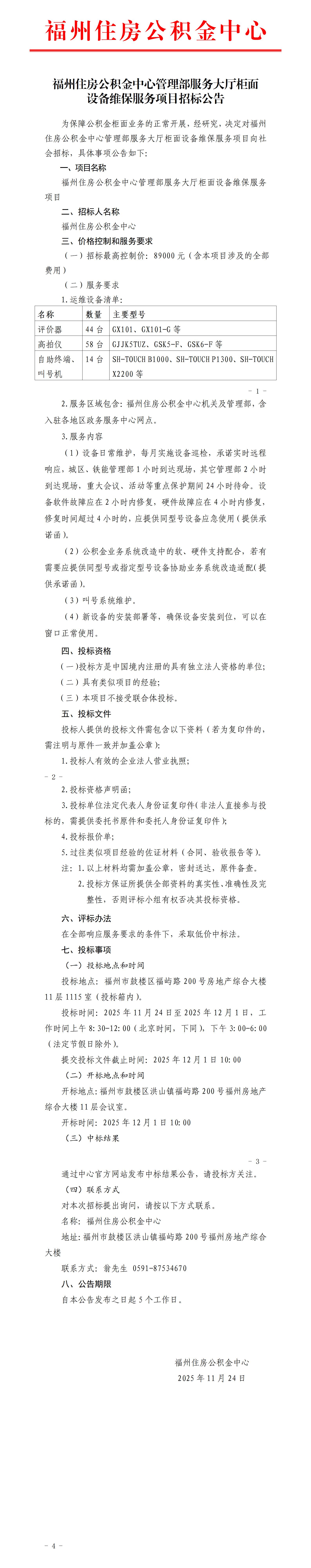 福州住房公积金中心管理部服务大厅柜面设备维保服务项目招标公告